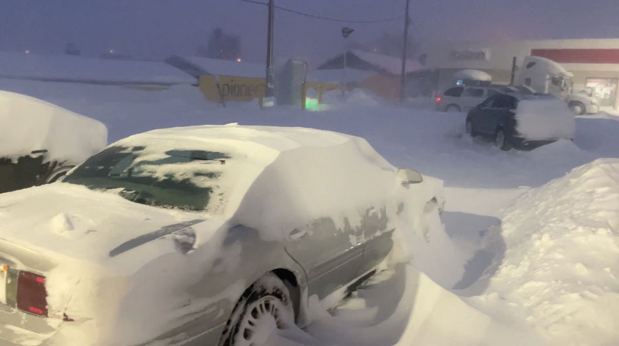 Vehicles are covered by snow in Murdo, South Dakota, U.S., December 16, 2022, in this screen grab taken from a social media video. Rick Dorion/via REUTERS