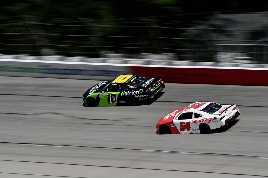 Sep 5, 2020; Darlington, South Carolina, USA; NASCAR Xfinity Series driver Ross Chastain (10) and NASCAR Xfinity Series driver Denny Hamlin (54) race during the VFW 200 at Darlington Raceway. Mandatory Credit: Jasen Vinlove-USA TODAY Sports