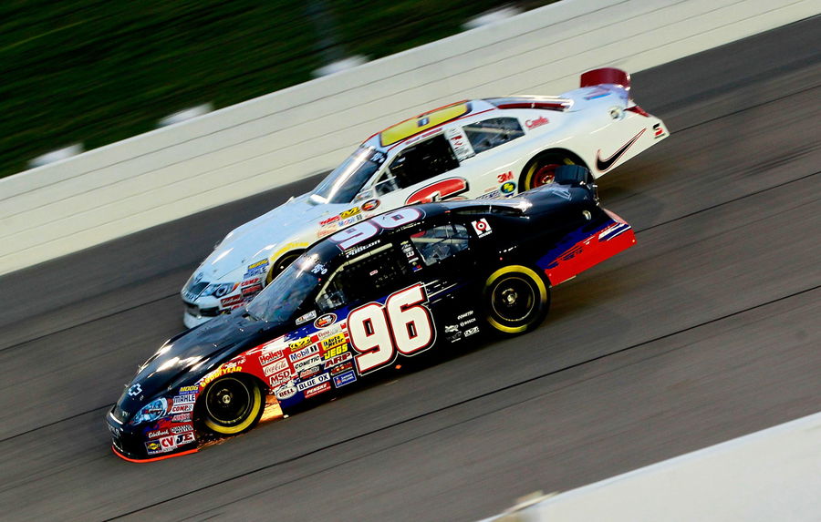 NEWTON, IA – AUGUST 01: Kenzi Ruston, driver of the #96 Ben Kennedy Racing Chevrolet leads Daniel Suarez, driver of the #6 Rev Racing Toyota during the NASCAR K&N Pro Series Autolite Iridium XP 150 at Iowa Speedway on August 1, 2014 in Newton, Iowa. (Photo by Brian Lawdermilk/NASCAR via Getty Images)