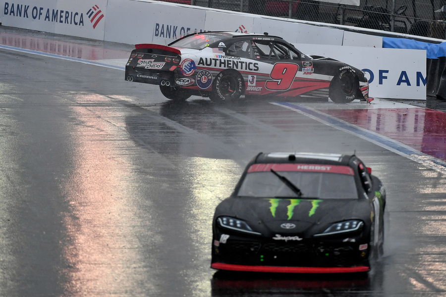 Concord, North Carolina, USA; NASCAR Xfinity Series driver Noah Gragson (9) hits the wall after being spun by NASCAR Xfinity Series driver Riley Herbst (18) during the Drive for the Cure 250 at Charlotte Motor Speedway. Mandatory Credit: Jasen Vinlove-USA TODAY Sports