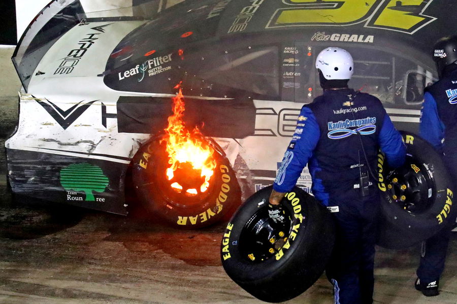 Feb 14, 2021; Daytona Beach, Florida, USA; NASCAR Cup Series driver Kaz Grala (16) has a fire in his car during the Daytona 500 at Daytona International Speedway. Mandatory Credit: Mark J. Rebilas-USA TODAY Sports TPX IMAGES OF THE DAY