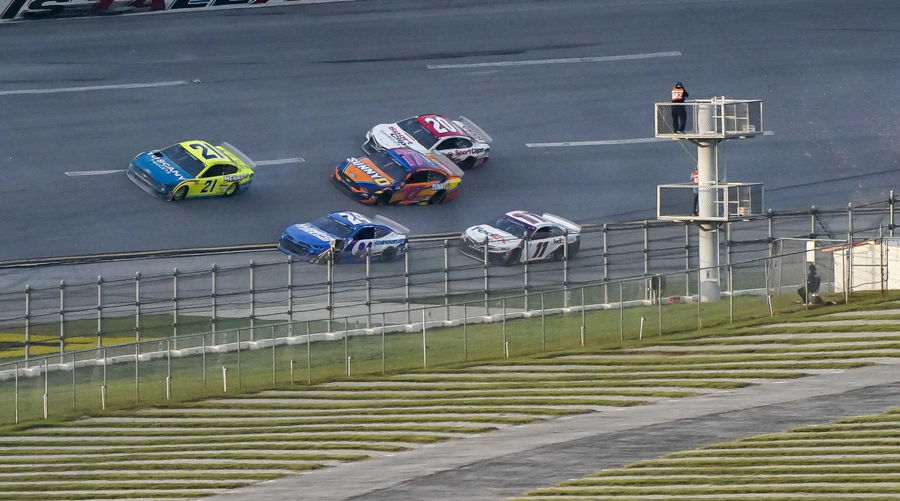 Oct 4, 2020; Lincoln, Alabama, USA; NASCAR Cup Series driver William Byron (24) and NASCAR Cup Series driver Denny Hamlin (11) go below the double yellow line coming out of turn 4 on the final lap during the Yellawood 500 at Talladega Superspeedway. Mandatory Credit: Marvin Gentry-USA TODAY Sports