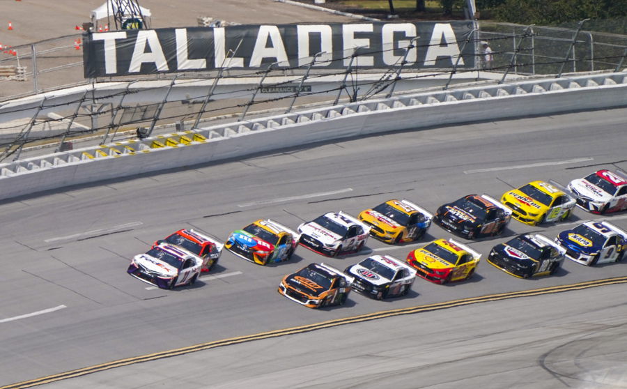 Oct 4, 2020; Lincoln, Alabama, USA; NASCAR Cup Series driver Denny Hamlin (11) leads the race field early in the Yellawood 500 at Talladega Superspeedway. Mandatory Credit: Marvin Gentry-USA TODAY Sportsascar