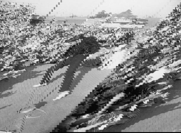 circa 1957: American singer and actor Elvis Presley (1935-1977) performing outdoors on a small stage to the adulation of a young crowd. (Photo by Hulton Archive/Getty Images)