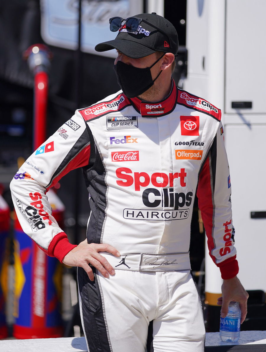 May 9, 2021; Darlington, South Carolina, USA; NASCAR Cup Series driver Denny Hamlin looks on prior to the Goodyear 400 at Darlington Raceway. Mandatory Credit: Jasen Vinlove-USA TODAY Sports