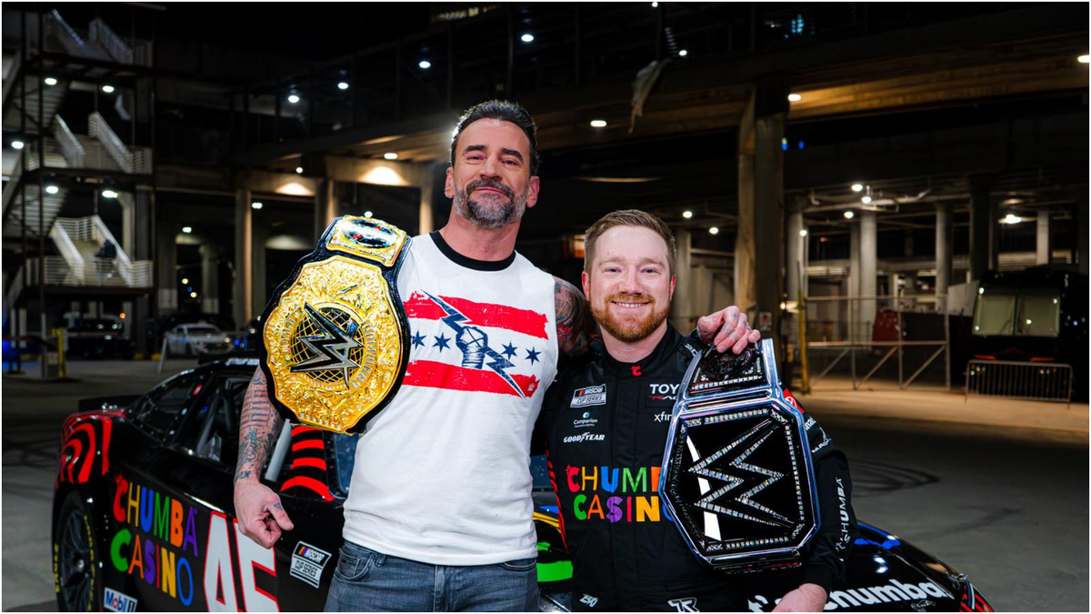 “The WINNER of the Daytona 500 @tyler_reddick arrives in style with the WrestleMania Title! AND is joined by World Heavyweight Champion @CMPunk! @ChumbaCasino | @23xiracing.”