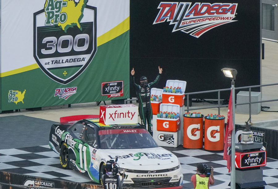 Oct 3, 2020; Lincoln, Alabama, USA; NASCAR Xfinity Series driver Justin Haley (11) celebrates after being declared the winner by NASCAR for the AgPro 300 at Talladega Superspeedway. Mandatory Credit: Marvin Gentry-USA TODAY Sports