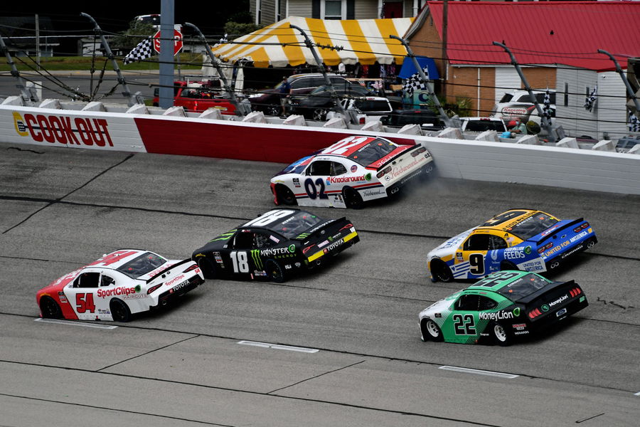 Sep 5, 2020; Darlington, South Carolina, USA; NASCAR Xfinity Series driver Brett Moffitt (02) hits the wall above Denny Hamlin (54), Riley Herbst (18), Austin Cindric (22) and Noah Gragson (9) during the VFW 200 at Darlington Raceway. Mandatory Credit: Jasen Vinlove-USA TODAY Sports