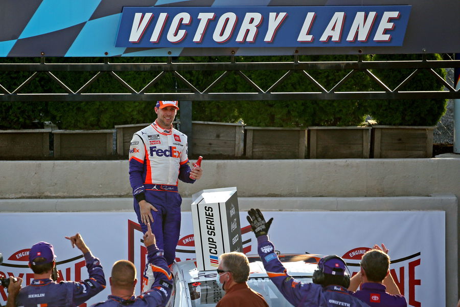 Aug 22, 2020; Dover, Delaware, USA; NASCAR Cup Series driver Denny Hamlin (11) celebrates in victory lane after winning the NASCAR Cup Series at Dover International Speedway. Mandatory Credit: Peter Casey-USA TODAY Sports | Credit: Reuters