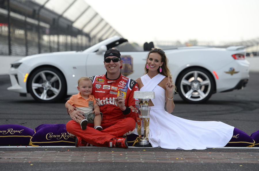 INDIANAPOLIS, IN – JULY 24: Kyle Busch, driver of the #18 Skittles Toyota, celebrates with his wife, Samantha, and son, Brexton, after winning the NASCAR Sprint Cup Series Crown Royal Presents the Combat Wounded Coalition 400 at Indianapolis Motor Speedway on July 24, 2016 in Indianapolis, Indiana. (Photo by Robert Laberge/Getty Images)