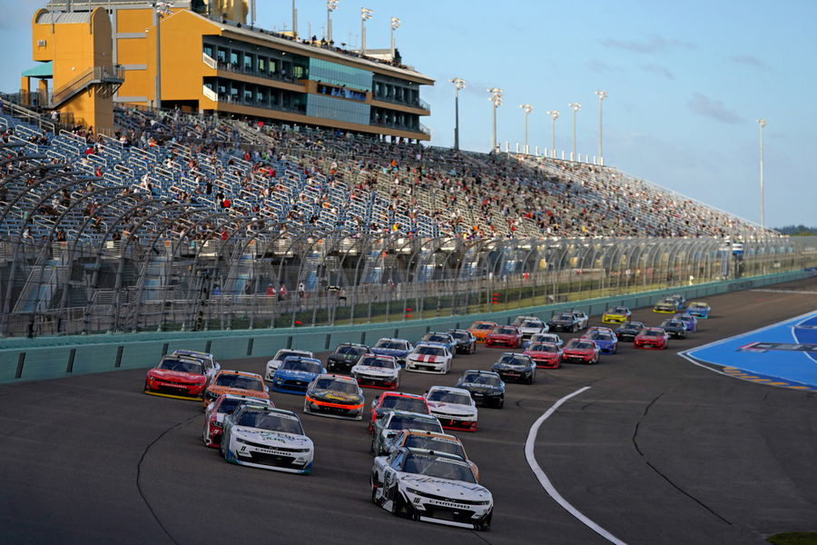 Feb 27, 2021; Miami, FL, USA; NASCAR Xfinity Series driver Daniel Hemric (18) and Austin Cindric (22) lead the field to start the Contender Boats 250 at Homestead-Miami Speedway. Mandatory Credit: Jasen Vinlove-USA TODAY Sports