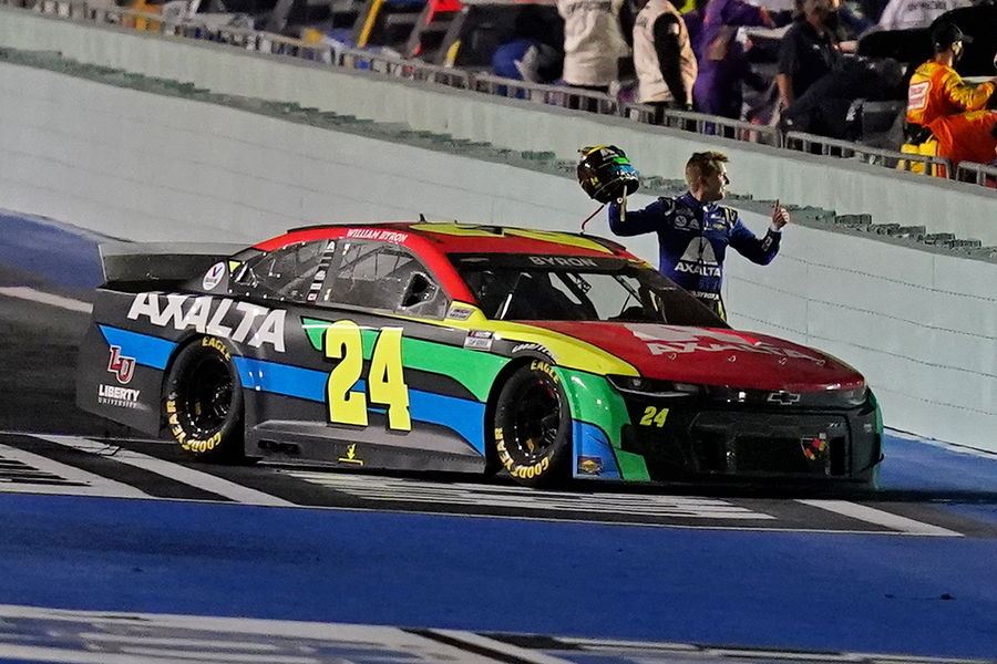 Feb 28, 2021; Homestead, Florida, USA; NASCAR Cup Series driver William Bryon (24) celebrates after winning the Dixie Vodka 400 Homestead-Miami Speedway. Mandatory Credit: Jasen Vinlove-USA TODAY Sports