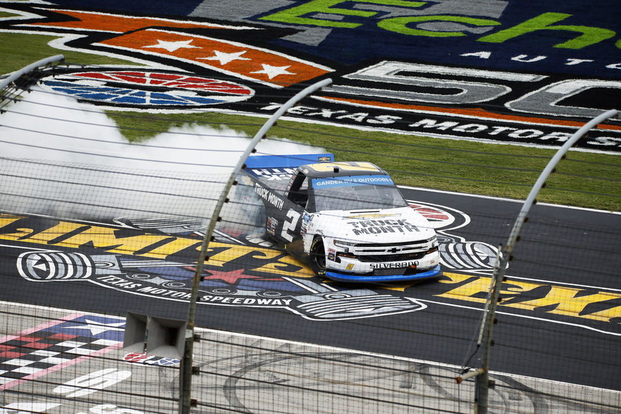 Oct 25, 2020; Fort Worth, TX, USA; NASCAR Gander RV and Outdoors Truck Series driver Sheldon Creed (2) does a burnout after winning the SpeedyCash.com 400 at Texas Motor Speedway. Mandatory Credit: Raymond Carlin III-USA TODAY Sports
