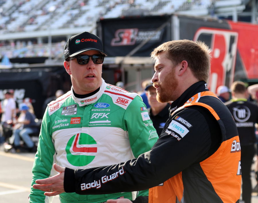 DAYTONA BEACH, FL – FEBRUARY 14: Brad Keselowski 6 RFK Racing Consumer Cellular Ford talks with teammate Chris Buescher 17 RFK Racing Body Guard Ford during final practice for the NASCAR, Motorsport, USA Cup Series Daytona 500 on February 14, 2026 at Daytona International Speedway in Daytona Beach, FL. Photo by Michael Bush/Icon Sportswire AUTO: FEB 14 NASCAR Cup Series Daytona 500 EDITORIAL USE ONLY Icon260214037