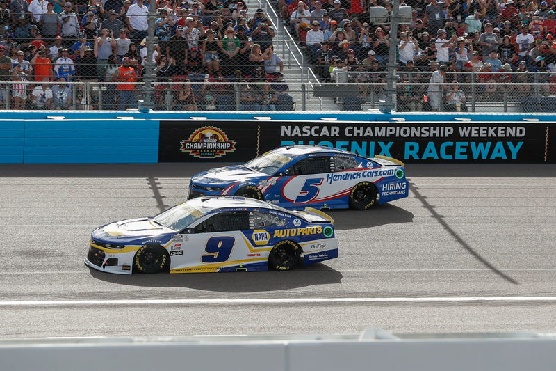LOS ANGELES, CA – FEBRUARY 05: Kyle Larson (#5 Hendrick Motorsports HendrickCars.com Chevrolet) looks at Chase Elliott (#9 Hendrick Motorsports NAPA Auto Parts Chevrolet) as he answers a question for a media press conference during the Busch Light Clash at The Coliseum NASCAR Cup Series race on February 05, 2022, at the Los Angeles Memorial Coliseum in Los Angeles, CA. (Photo by Chris Williams/Icon Sportswire via Getty Images)