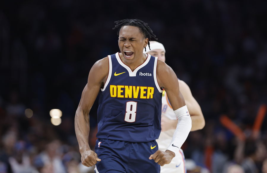 Mar 10, 2025; Oklahoma City, Oklahoma, USA; Denver Nuggets forward Peyton Watson (8) screams after scoring against the Oklahoma City Thunder during the second half at Paycom Center. Mandatory Credit: Alonzo Adams-Imagn Images