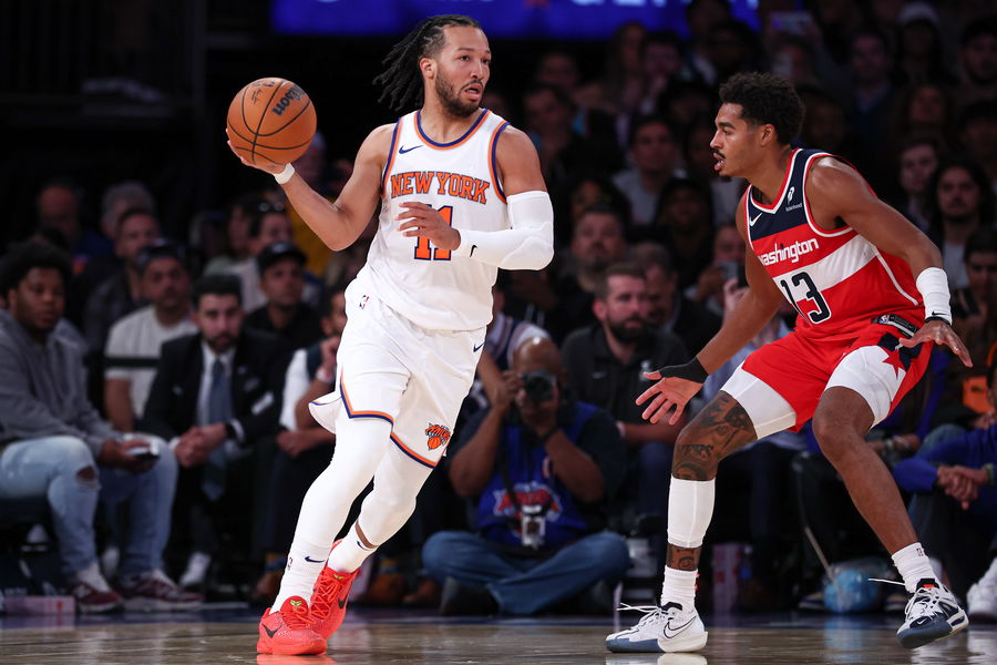 Oct 9, 2024; New York, New York, USA; New York Knicks guard Jalen Brunson (11) dribbles as Washington Wizards guard Jordan Poole (13) defends during the first half at Madison Square Garden. Mandatory Credit: Vincent Carchietta-Imagn Images
