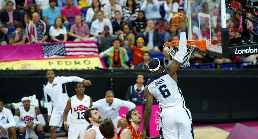 Aug. 12, 2012 – London, England, United Kingdom – LEBRON JAMES dunks in the waning minutes of the fourth quarter before Team USA, the ‘Dream Team’ wins the gold medal basketball game against Spain during the 2012 London Summer Olympics. (Credit Image: �� Mark Makela) (Photo by Mark Makela/Corbis via Getty Images)