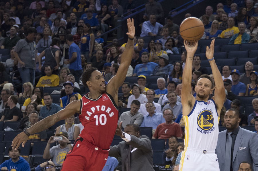 Feb 27, 2015; Toronto, Ontario, CAN; Golden State Warriors guard Stephen Curry (30) beats Toronto Raptors guard DeMar DeRozan (10) to a loose ball during the first half at the Air Canada Centre. Mandatory Credit: John E. Sokolowski-Imagn Images