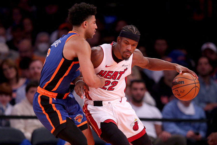 Nov 24, 2023; New York, New York, USA; Miami Heat forward Jimmy Butler (22) controls the ball against New York Knicks guard Quentin Grimes (6) during the third quarter at Madison Square Garden. Mandatory Credit: Brad Penner-USA TODAY Sports