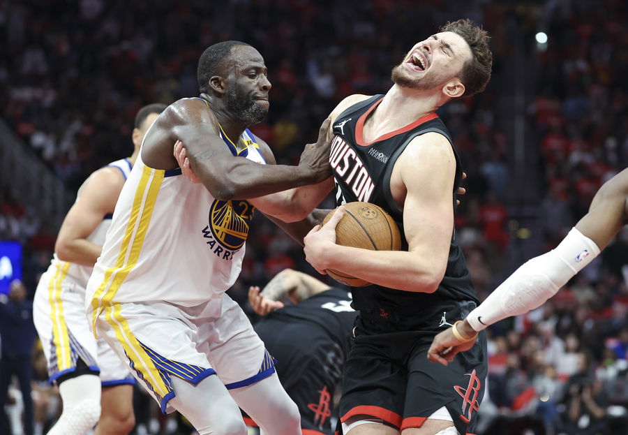 Dec 11, 2024; Houston, Texas, USA; Golden State Warriors forward Draymond Green (23) fouls Houston Rockets center Alperen Sengun (28) during the fourth quarter at Toyota Center. Mandatory Credit: Troy Taormina-Imagn Images