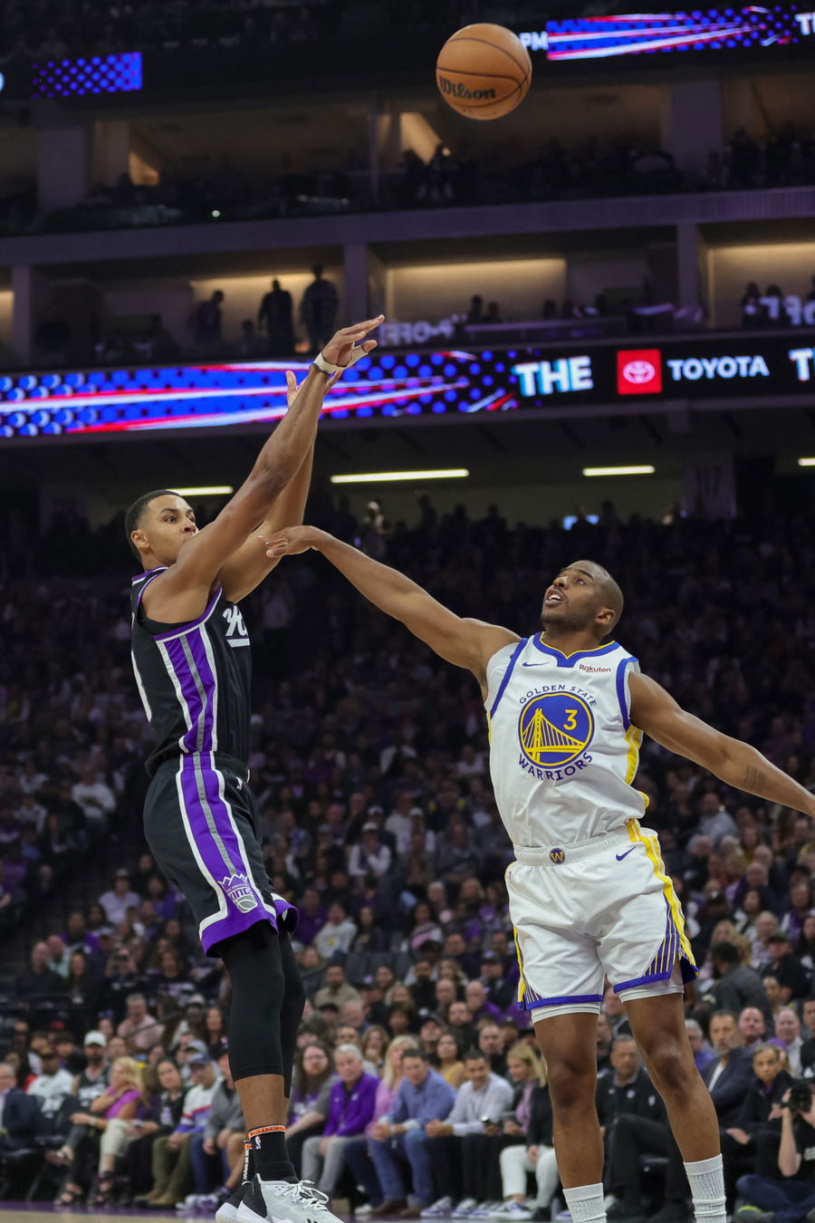 Oct 27, 2023; Sacramento, California, USA; Sacramento Kings forward Keegan Murray (13) shoots the ball over Golden State Warriors guard Chris Paul (3) during the first quarter at Golden 1 Center. Mandatory Credit: Sergio Estrada-USA TODAY Sports