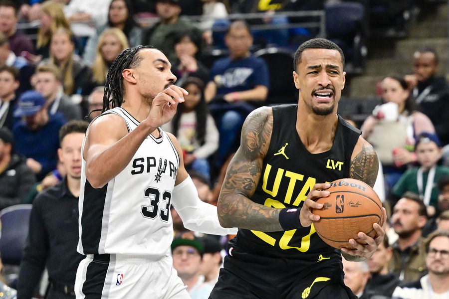 Nov 26, 2024; Salt Lake City, Utah, USA; Utah Jazz forward/center John Collins (20) reacts to an offensive foul against San Antonio Spurs guard Tre Jones (33) during the first half at the Delta Center. Mandatory Credit: Christopher Creveling-Imagn Images