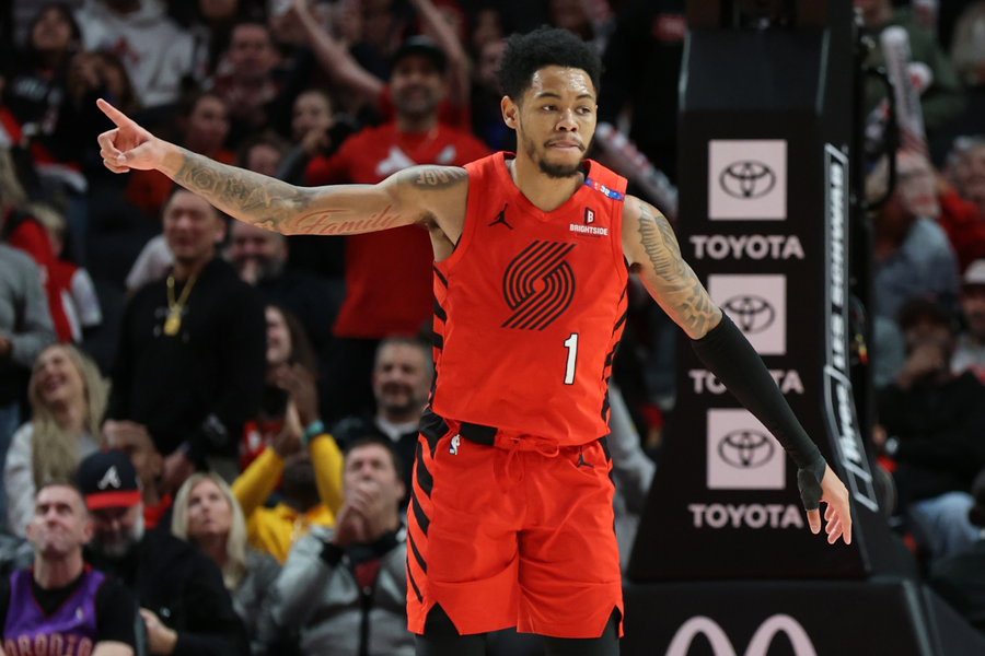 Mar 16, 2025; Portland, Oregon, USA; Portland Trail Blazers guard Anfernee Simons (1) reacts after scoring against the Toronto Raptors in the second half at Moda Center. Mandatory Credit: Jaime Valdez-Imagn Images