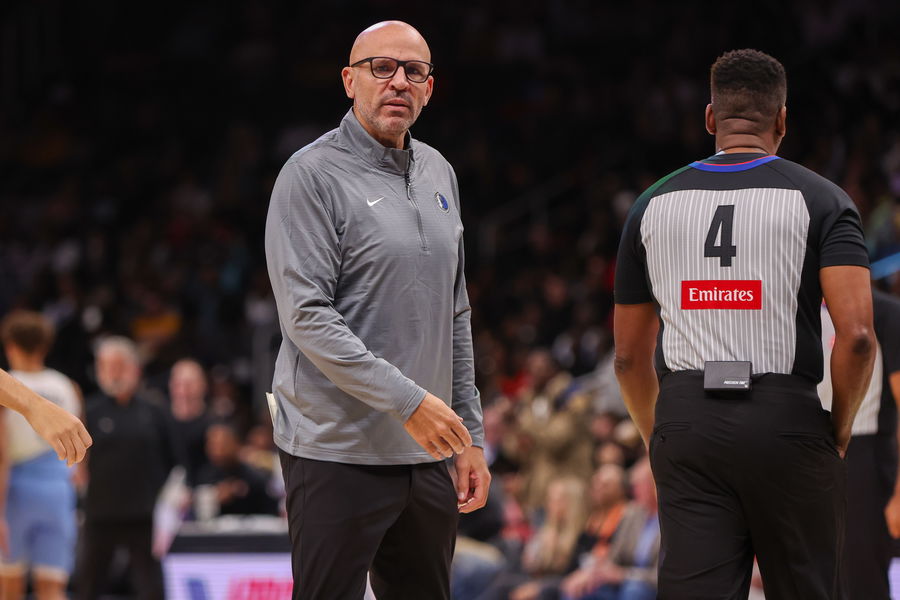 Nov 25, 2024; Atlanta, Georgia, USA; Dallas Mavericks head coach Jason Kidd talks to referee Sean Wright (4) against the Atlanta Hawks in the first quarter at State Farm Arena. Mandatory Credit: Brett Davis-Imagn Images