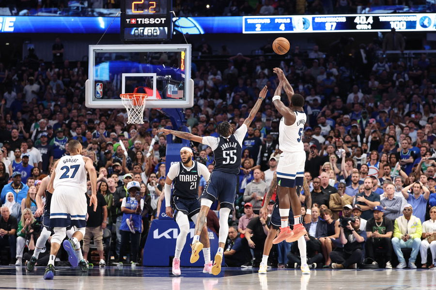 May 28, 2024; Dallas, Texas, USA; Minnesota Timberwolves guard Anthony Edwards (5) shoots as Dallas Mavericks forward Derrick Jones Jr. (55) defends during the fourth quarter of game four of the western conference finals for the 2024 NBA playoffs at American Airlines Center. Mandatory Credit: Kevin Jairaj-USA TODAY Sports