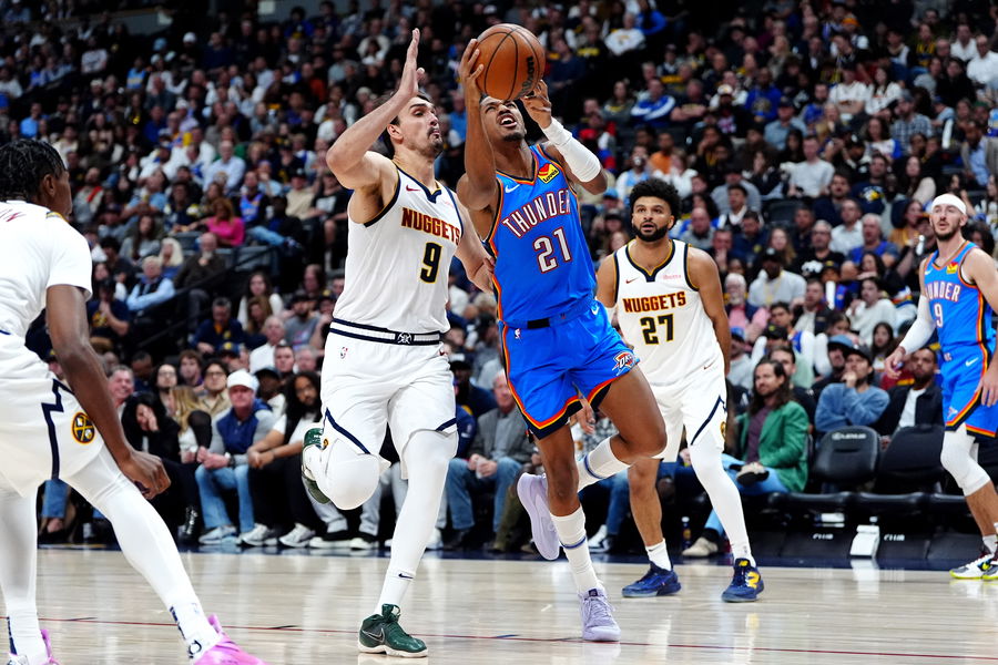 Oct 24, 2024; Denver, Colorado, USA; Denver Nuggets forward Dario Saric (9) defends on Oklahoma City Thunder guard Aaron Wiggins (21) in the second quarter at Ball Arena. Mandatory Credit: Ron Chenoy-Imagn Images