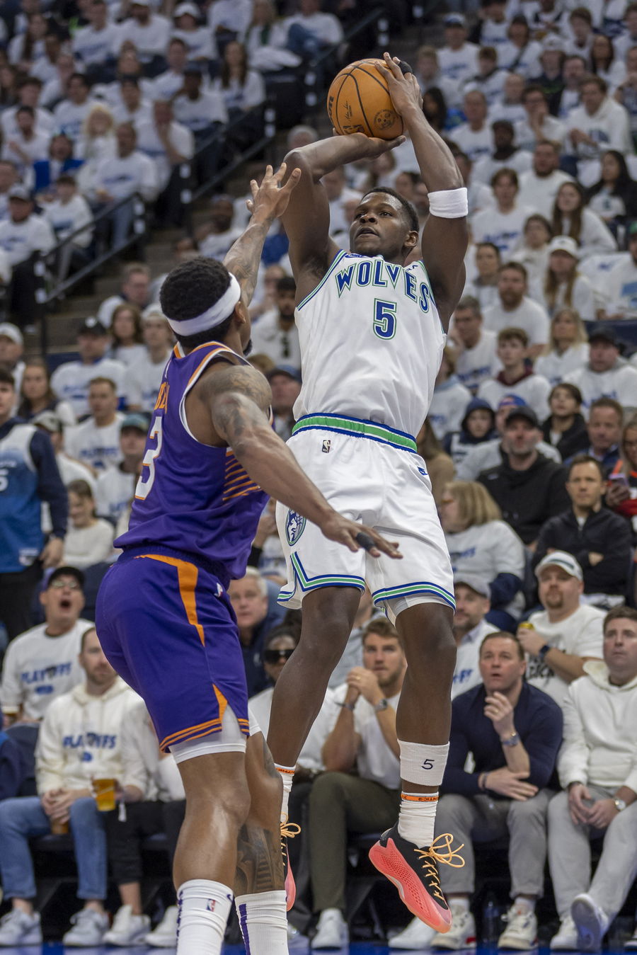 Apr 20, 2024; Minneapolis, Minnesota, USA; Minnesota Timberwolves guard Anthony Edwards (5) shoots the ball over Phoenix Suns guard Bradley Beal (3) in the second half during game one of the first round for the 2024 NBA playoffs at Target Center. Mandatory Credit: Jesse Johnson-USA TODAY Sports