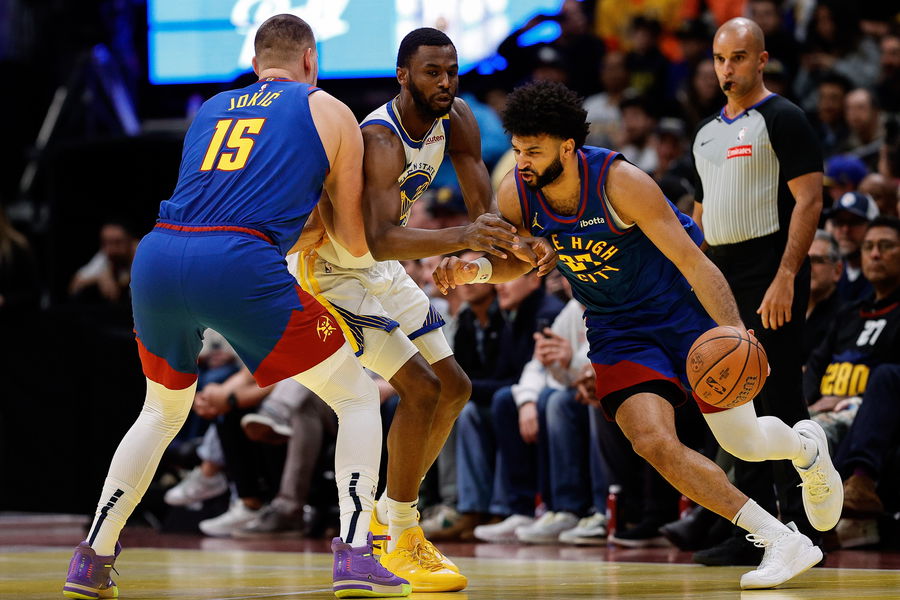 Dec 3, 2024; Denver, Colorado, USA; Denver Nuggets guard Jamal Murray (27) controls the ball as center Nikola Jokic (15) screens against Golden State Warriors forward Andrew Wiggins (22) in the first quarter at Ball Arena. Mandatory Credit: Isaiah J. Downing-Imagn Images