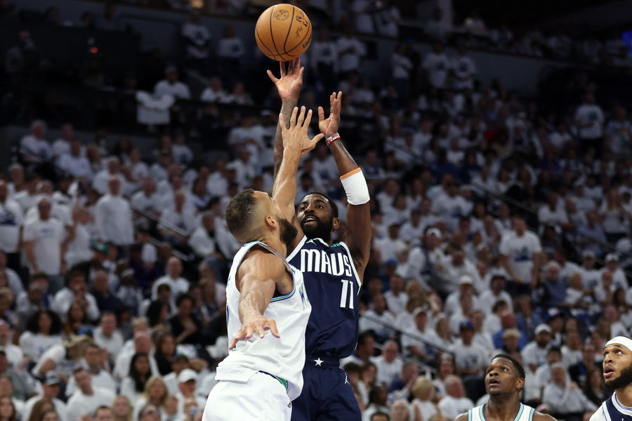 May 22, 2024; Minneapolis, Minnesota, USA; Dallas Mavericks guard Kyrie Irving (11) shoots against Minnesota Timberwolves center Rudy Gobert (27) in the first quarter during game one of the western conference finals for the 2024 NBA playoffs at Target Center. Mandatory Credit: Jesse Johnson-USA TODAY Sports