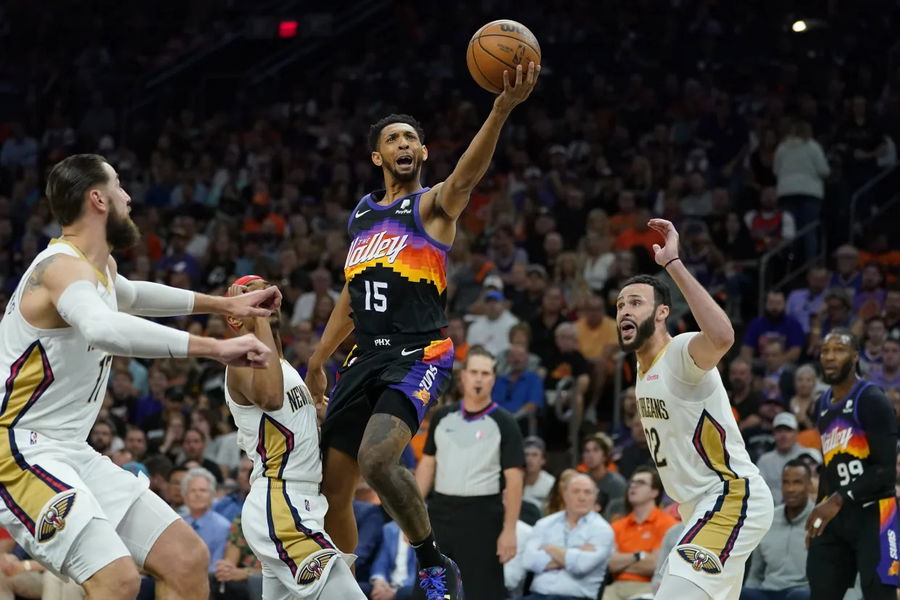Phoenix Suns guard Cameron Payne (15) shoots as New Orleans Pelicans forward Larry Nance Jr. (22) looks on during the first half of Game 5 of an NBA basketball first-round playoff series, Tuesday, April 26, 2022, in Phoenix. (AP Photo/Matt York)