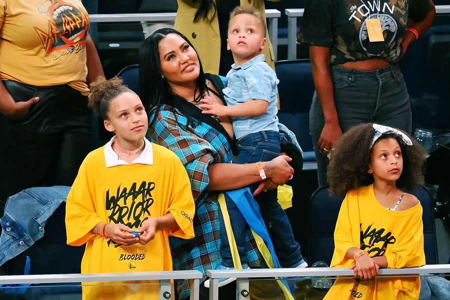 May 26, 2022; San Francisco, California, USA; Ayesha Curry, wife of Golden State Warriors guard Stephen Curry (not pictured), with her children after winning game five of the 2022 Western Conference Finals against the Dallas Mavericks at Chase Center. Mandatory Credit: Kelley L Cox-USA TODAY Sports