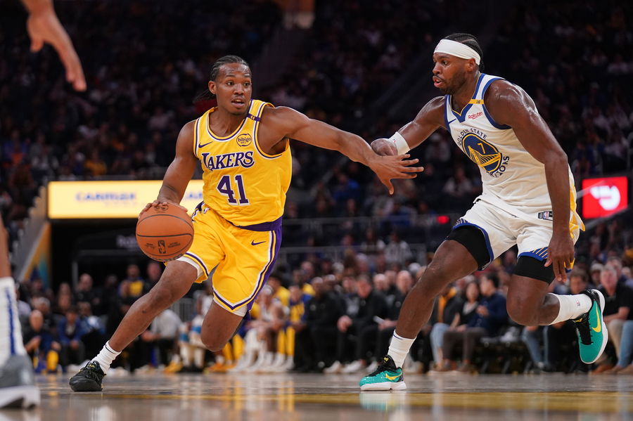 Oct 18, 2024; San Francisco, California, USA; Los Angeles Lakers guard Quincy Olivari (41) dribbles past Golden State Warriors guard Buddy Hield (7) in the second quarter at the Chase Center. Mandatory Credit: Cary Edmondson-Imagn Images