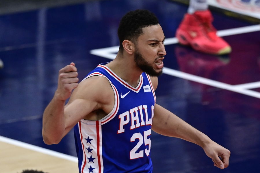 May 31, 2021; Washington, District of Columbia, USA; Philadelphia 76ers guard Ben Simmons (25) reacts after the basket during the first quarter against the Washington Wizards during game four in the first round of the 2021 NBA Playoffs. at Capital One Arena. Mandatory Credit: Tommy Gilligan-USA TODAY Sports