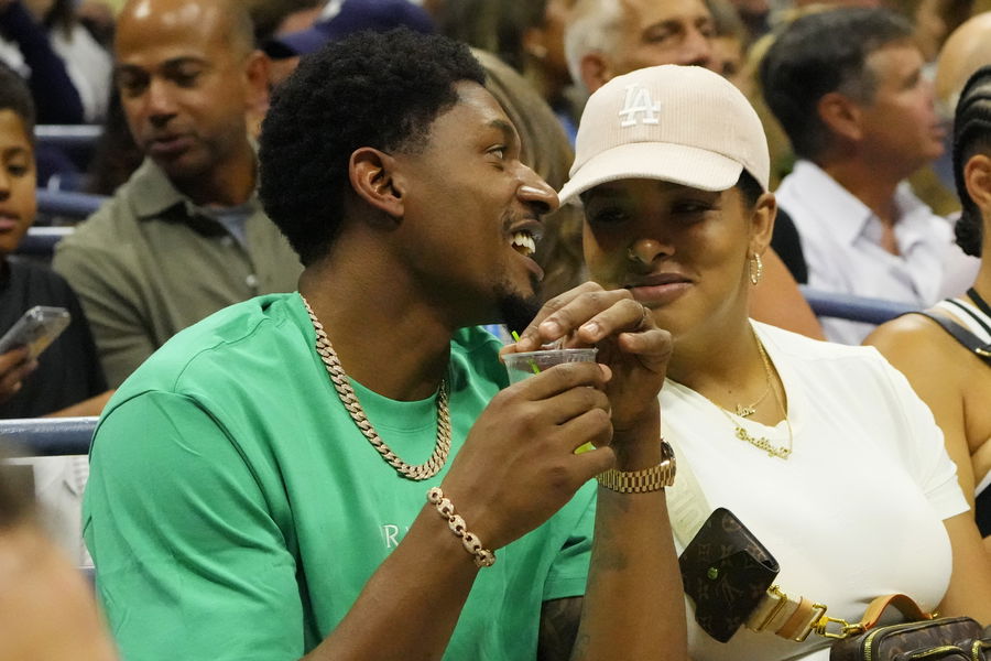 Sep 9, 2022; Flushing, NY, USA; Washington Wizards forward Bradley Beal (L) talks with wife Kamiah Adams-Beal (R) while sitting in the player’s box of Frances Tiafoe (USA) (not pictured) during the match against Carlos Alcaraz (ESP) (not pictured) in a men’s singles semifinal on day twelve of the 2022 U.S. Open tennis tournament at USTA Billie Jean King Tennis Center. Mandatory Credit: Robert Deutsch-USA TODAY Sports