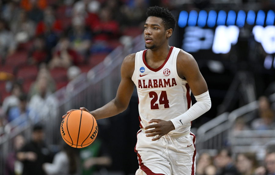 Mar 24, 2023; Louisville, KY, USA; Alabama Crimson Tide forward Brandon Miller (24) dribbles during the second half of the NCAA tournament round of sixteen against the San Diego State Aztecs at KFC YUM! Center. Mandatory Credit: Jamie Rhodes-USA TODAY Sports.