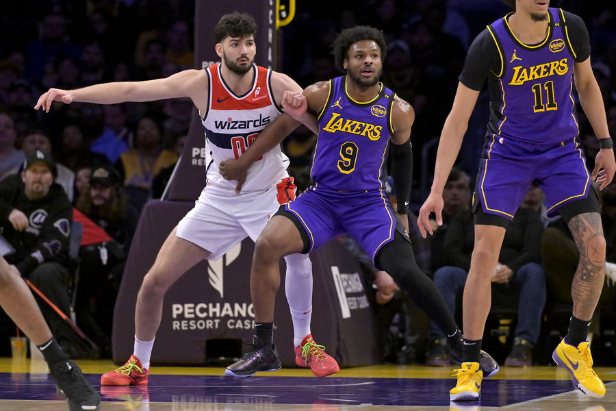 Jan 21, 2025; Los Angeles, California, USA; Los Angeles Lakers guard Bronny James (9) defends Washington Wizards forward Tristan Vukcevic (00) in the second half at Crypto.com Arena. Mandatory Credit: Jayne Kamin-Oncea-Imagn Images