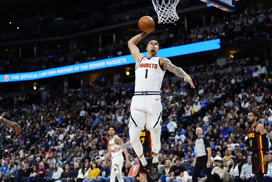 Jan 1, 2025; Denver, Colorado, USA; Denver Nuggets forward Michael Porter Jr. (1) finishes off a basket in the second quarter against the Atlanta Hawks at Ball Arena. Mandatory Credit: Ron Chenoy-Imagn Images