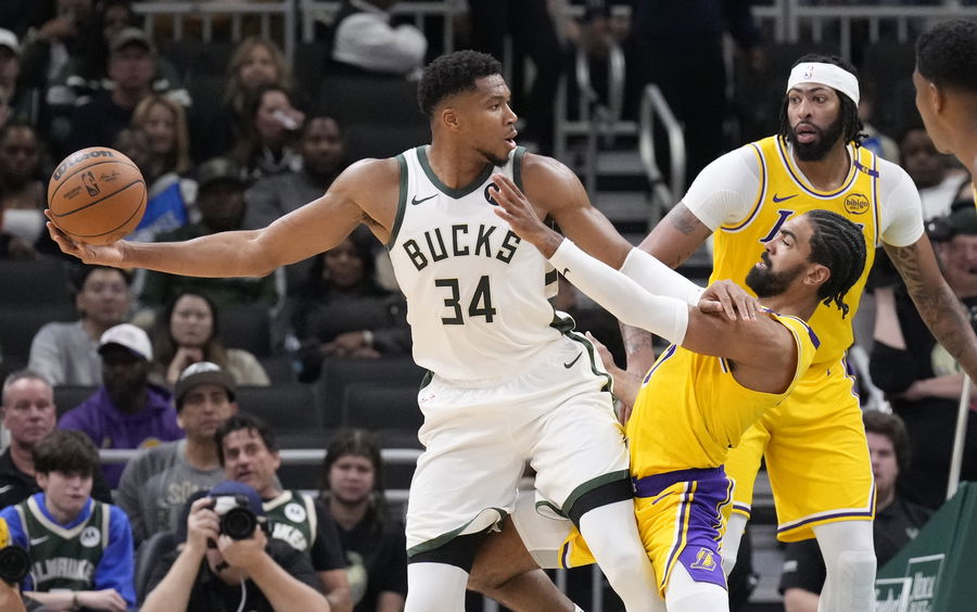 Oct 10, 2024; Milwaukee, Wisconsin, USA; Milwaukee Bucks forward Giannis Antetokounmpo (34) controls the ball as Los Angeles Lakers forward Rui Hachimura (28) defends in the first half at Fiserv Forum. Mandatory Credit: Michael McLoone-Imagn Images