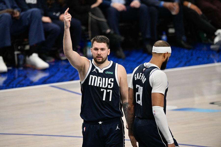 May 28, 2024; Dallas, Texas, USA; Dallas Mavericks guard Luka Doncic (77) gestures during the third quarter against the Minnesota Timberwolves in game four of the western conference finals for the 2024 NBA playoffs at American Airlines Center. Mandatory Credit: Jerome Miron-USA TODAY Sports