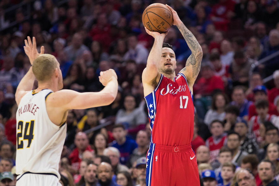 Feb 8, 2019; Philadelphia, PA, USA; Philadelphia 76ers guard JJ Redick (17) shoots the ball past Denver Nuggets forward Mason Plumlee (24) during the third quarter at Wells Fargo Center. Mandatory Credit: Bill Streicher-USA TODAY Sports