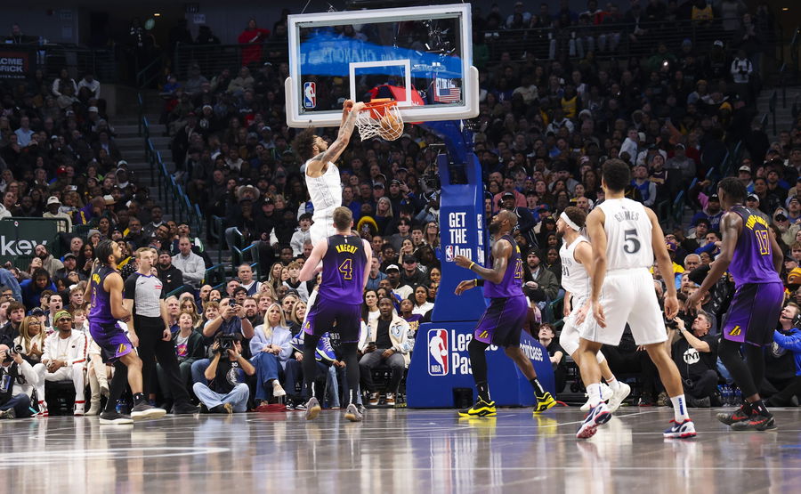 Jan 7, 2025; Dallas, Texas, USA; Dallas Mavericks center Dereck Lively II (2) dunks during the second half against the Los Angeles Lakers at American Airlines Center. Mandatory Credit: Kevin Jairaj-Imagn Images