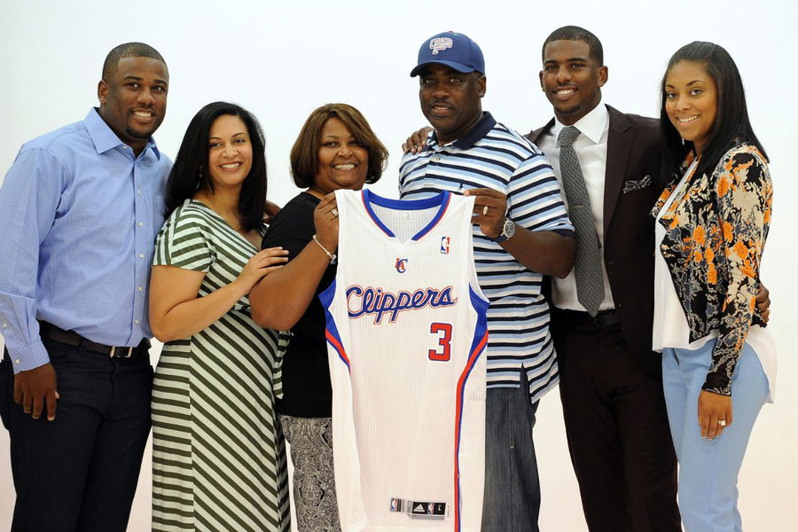 Jul 10, 2013; Playa Vista, CA, USA; The family of Los Angeles Clippers guard Chris Paul (second right) pose for a photo after today’s press conference held at the team headquarters. (From left to right) Chris’s brother CJ Paul, sister-in-law Deserie, mother Robin, father Charles and wife Jada. Mandatory Credit: Jayne Kamin-Oncea-Imagn Images
