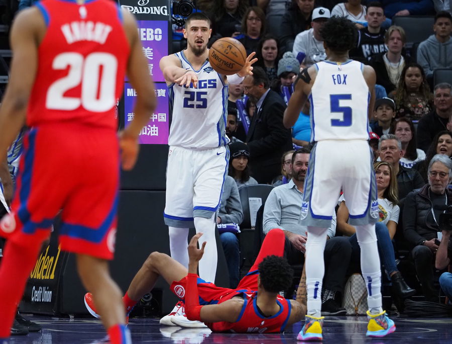 Mar 1, 2020; Sacramento, California, USA; Sacramento Kings center Alex Len (25) passes the ball to guard De’Aaron Fox (5) above Detroit Pistons forward Christian Wood (35) during the fourth quarter at Golden 1 Center. Mandatory Credit: Kelley L Cox-USA TODAY Sports