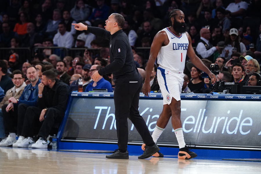 Nov 6, 2023; New York, New York, USA; Los Angeles Clipper head coach Tyronn Lue gestures on the court as Los Angeles Clipper shooting guard James Harden (1) walks during the first half against the New York Knicks at Madison Square Garden. Mandatory Credit: Gregory Fisher-USA TODAY Sports