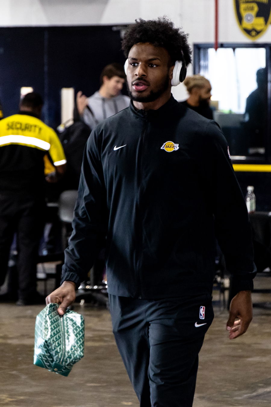 Nov 16, 2024; New Orleans, Louisiana, USA; Los Angeles Lakers guard Bronny James arrives at the arena before the game against the New Orleans Pelicans at Smoothie King Center. Mandatory Credit: Stephen Lew-Imagn Images
